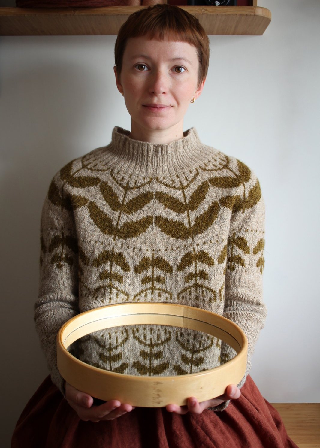 The pullover is knit top-down in the round with a large botanical colourwork pattern on the yoke and a smaller one on the body and sleeves. The pattern also comes with three neck options: ruffled mock (as shown in my sample), double folded and a regular crew neck.