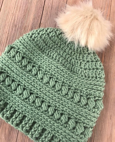 The Bead Stitch Hat is a slightly slouchy hat made by combining rounds of bead stitch with rounds of half double crochet to give it a lot of texture. It is finished with a post stitch ribbing along the bottom and a faux fur pom pom on the top.