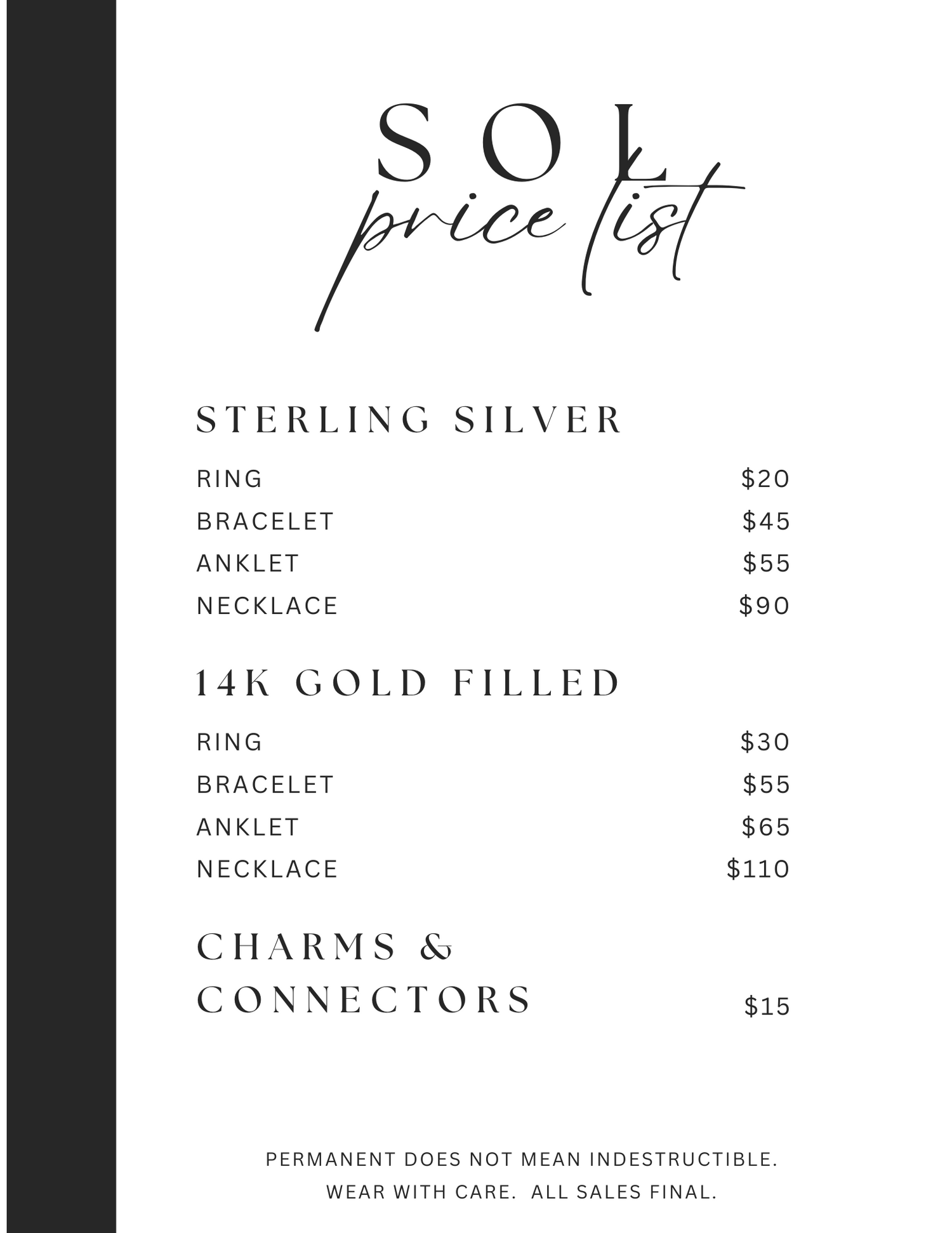 Permanent jewelry is a piece of jewelry (typically a bracelet, anklet, or necklace) that does not have a traditional clasp, so it cannot be easily removed. Instead, the ends of the jewelry are soldered together while you're wearing them, creating a seamless look.