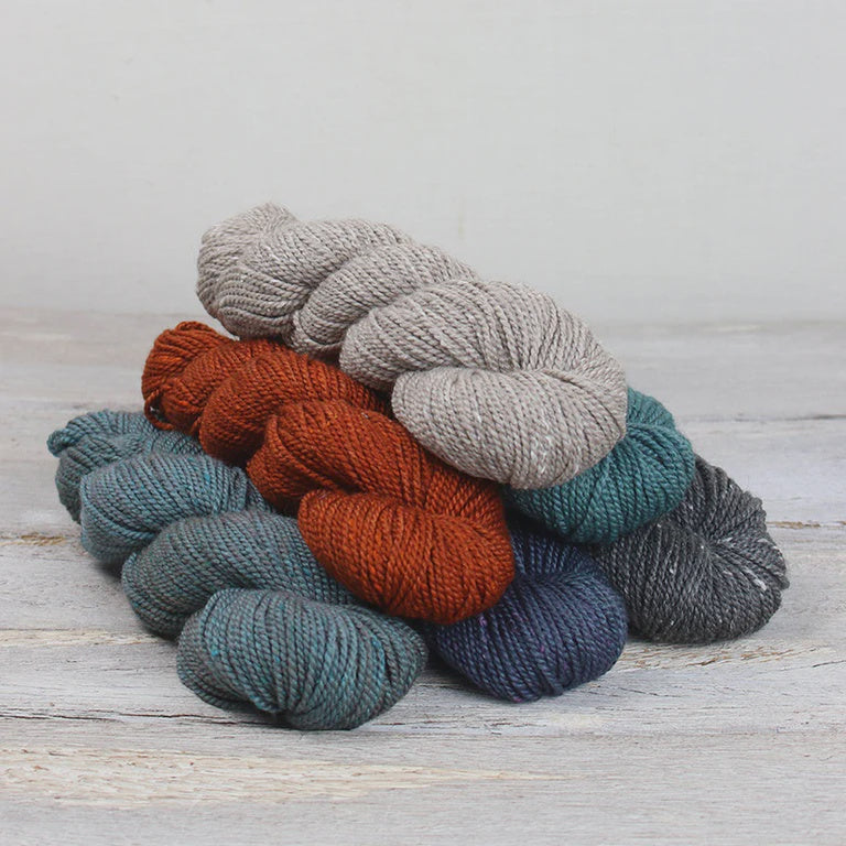 Inspired by rugged rocky coastlines, Acadia is a rustic blend of fine Merino wool (providing warmth) and baby alpaca and silk noil (adding drape and luster as well as an interesting knobbly texture). The heathered appearance of this DK weight yarn is achieved from a kettle dyeing process that creates the subtle duotones for which The Fibre Co. has become known.